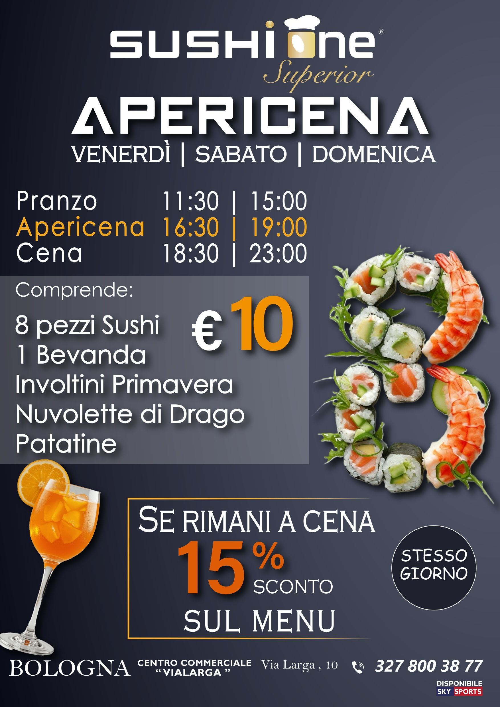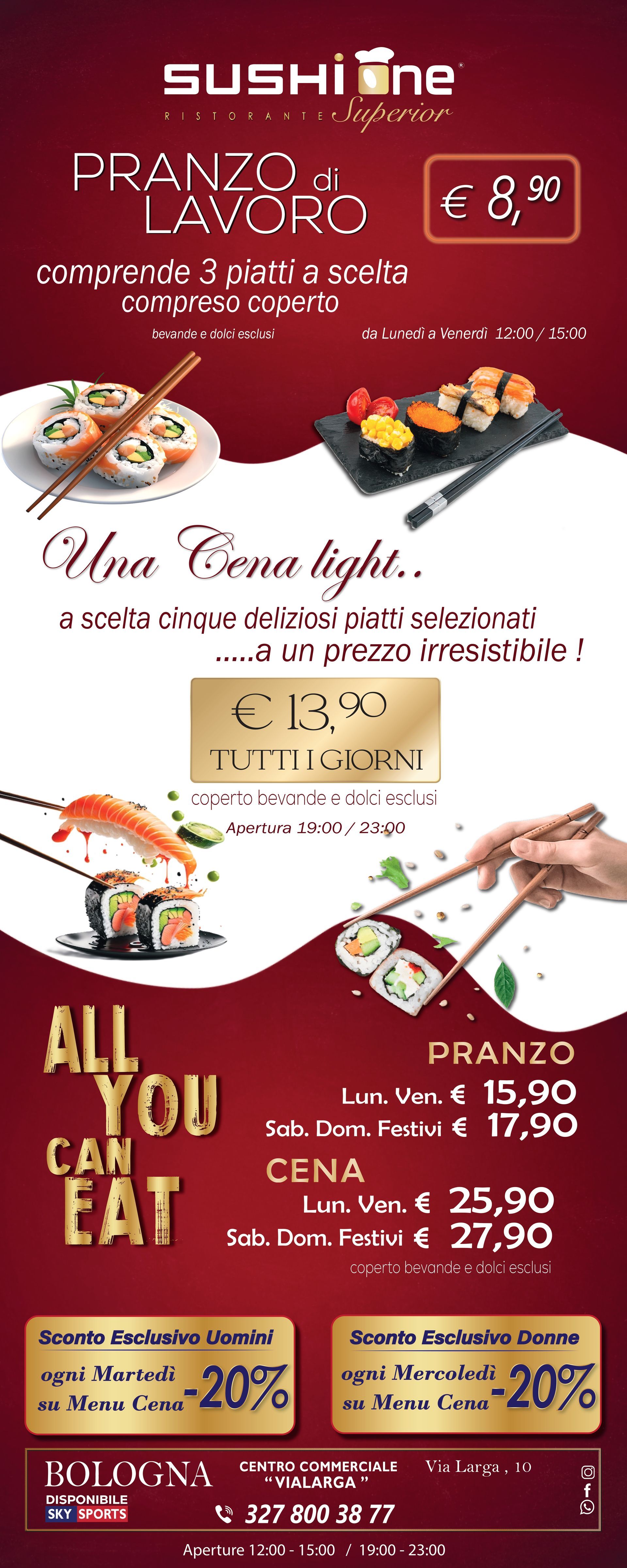 Il nuovissimo ristorante Sushi One Superior, situato nel Centro Commerciale Vialarga in Via Larga 10 a Bologna, propone un'esperienza culinaria che vi conquisterà al primo assaggio. Vi accoglieremo in un ambiente moderno, elegante e scenografico che incanterà i vostri occhi e delizierà il vostro palato con autentici piatti della cucina orientale, nello specifico cinese e giapponese, serviti con cura e attenzione al dettaglio.